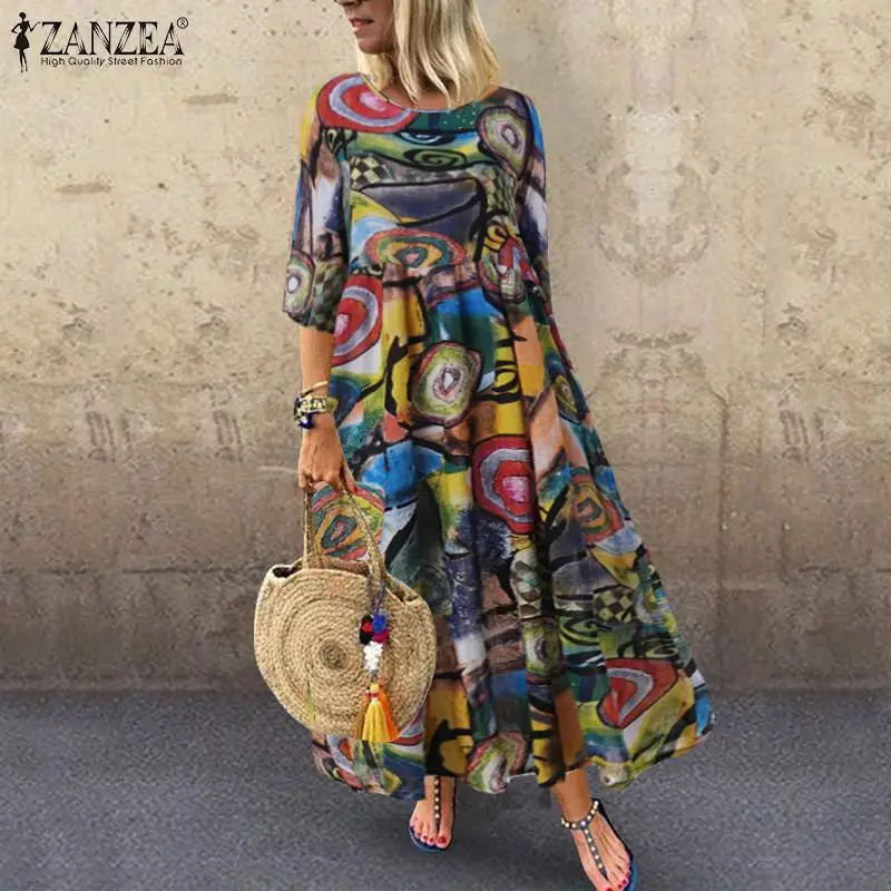 pricecomparisonfor 2019 Autumn Summer Long Maxi Dresses ZANZEA Dress Women Vintage Vestidos Robe Pleated Printed Plus