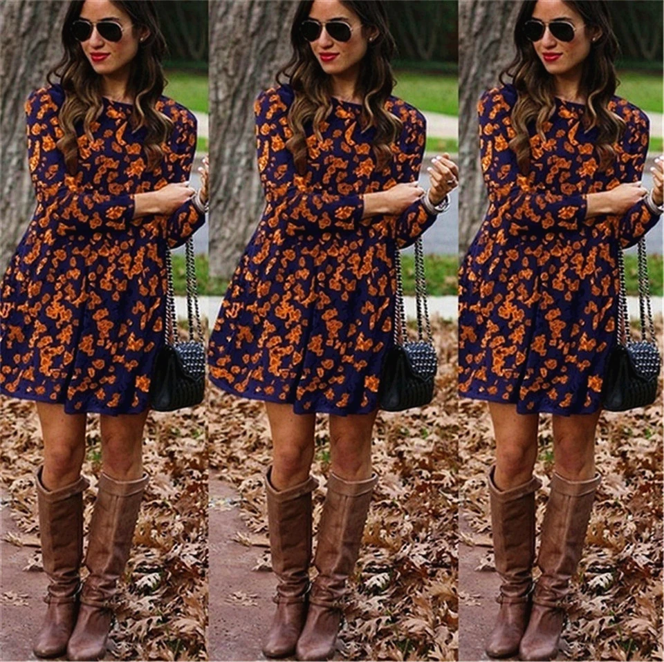 - New Fashion Women Long Sleeves Dress Round Neck Print Bohemia Dresses Lady Knee-Length Slim Fit Casual Spring Dress with Button